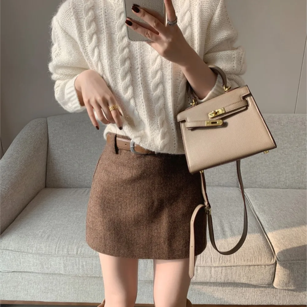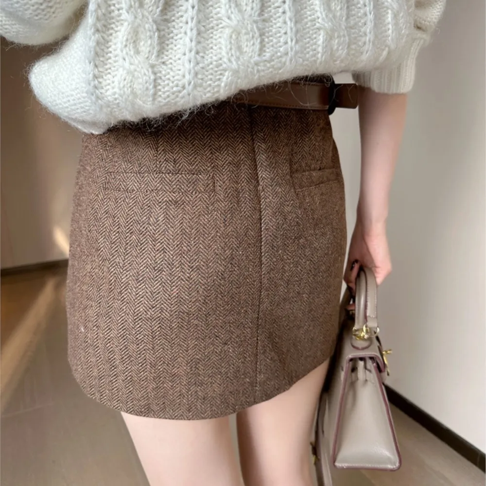 2024 Autumn Winter Soft Woolen High Waist Mini Skirt Women A-line Package Hips Short Skater Party Femme Camel Gray