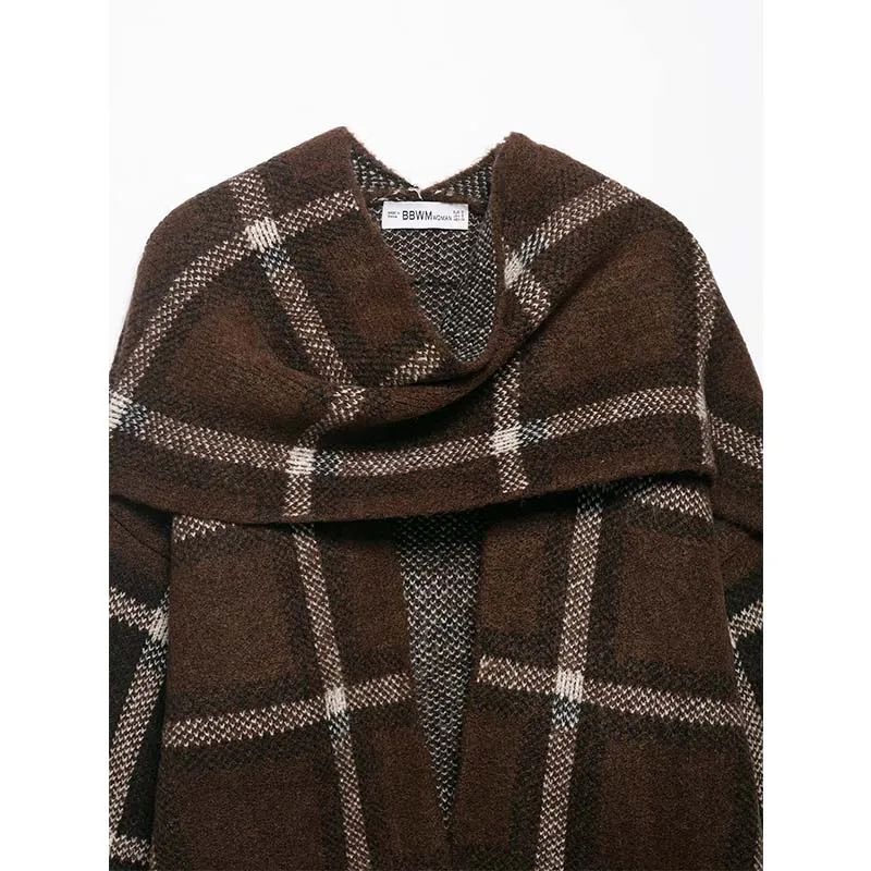 2025 New Women Fashion Plaid Knitted Cardigans Long Sleeve Scarf Collar Sweater Cardigan Autumn Winter New Style Knitwear Coat