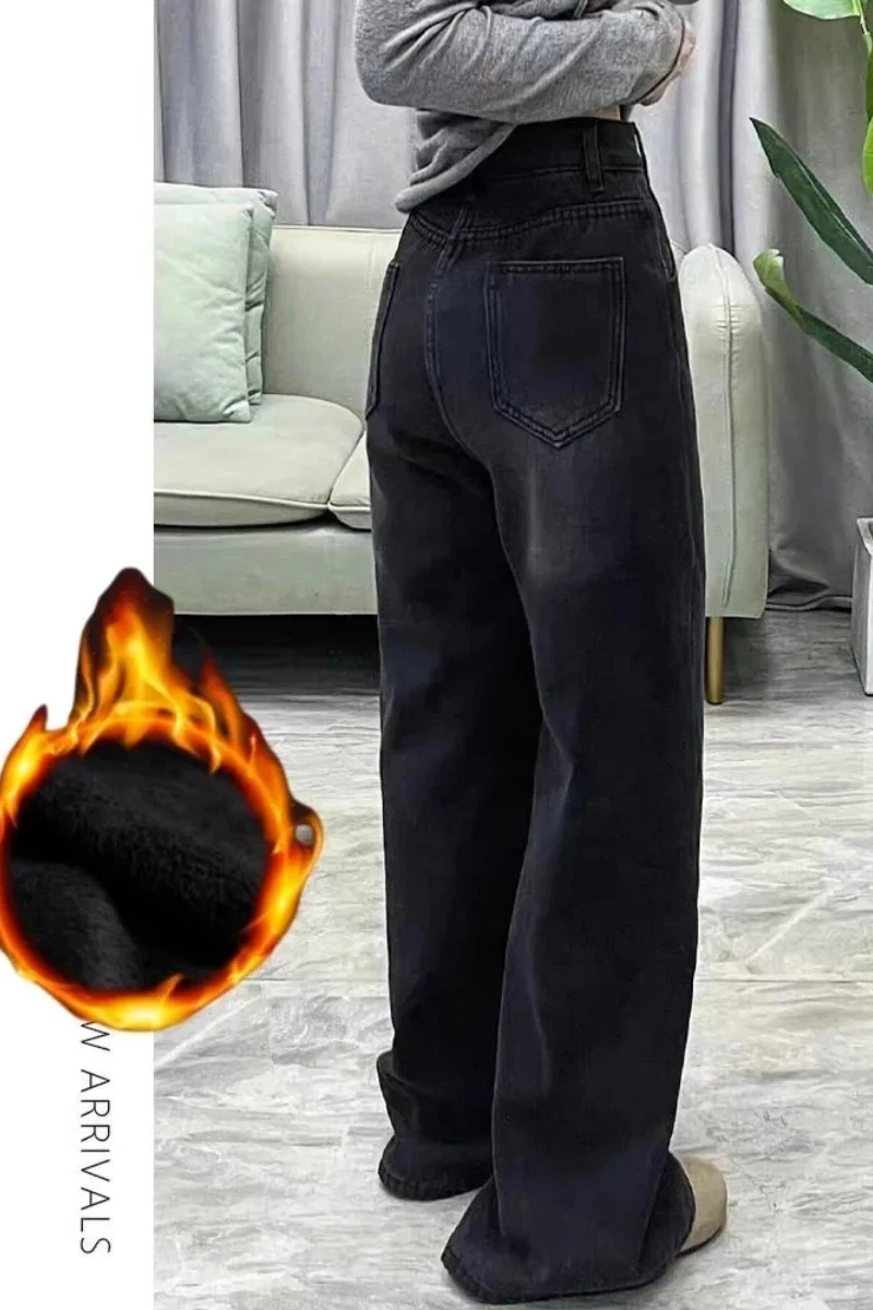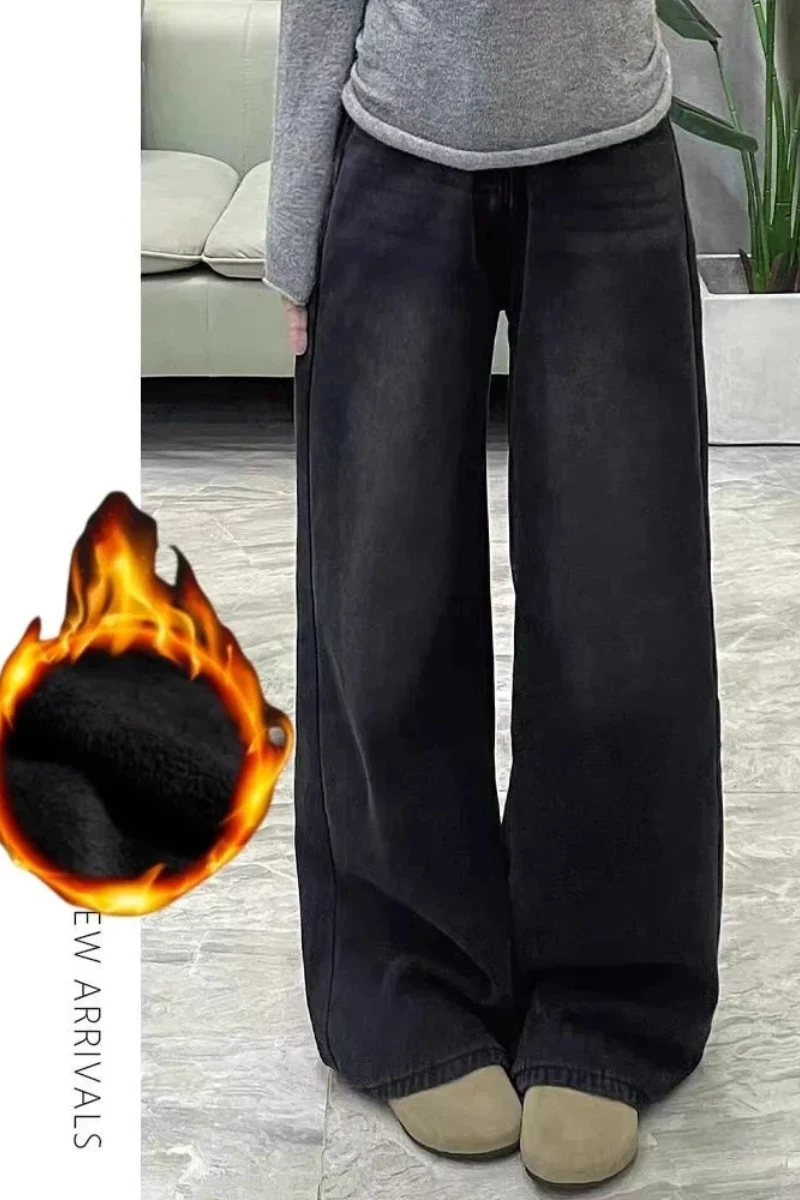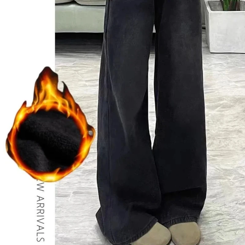 Womens Jeans Y2k Jeans Flared Trousers Black Gray Straight Leg Winter Warm Fleece Lined Loose Fit High Waist Wide Leg Fashion